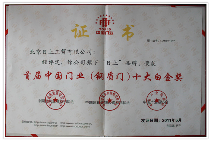 2011年5月在 “中国门业发展研究报告中国门业知名品牌”发布会上“日上”品牌荣获“中国门业(钢质门)十大白金奖”。