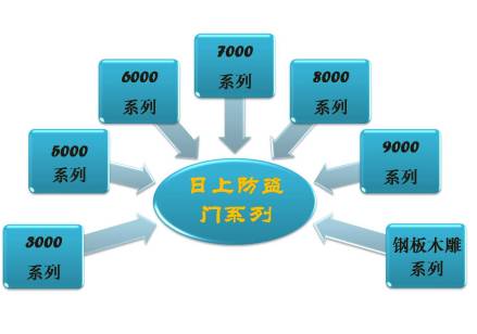 日上防盗门产品共有:3000系列、5000系列、6000系列、7000系列、8000系列、9000系列(至尊系列)、钢板木雕系列。其中3000系列、6000系列、7000系列、钢板木雕系列最受市场欢迎。各系列在严格遵守防盗门国家标准的同时,又各具自身特点。各系列最大的差别在于门扇厚度、锁具样式不同。