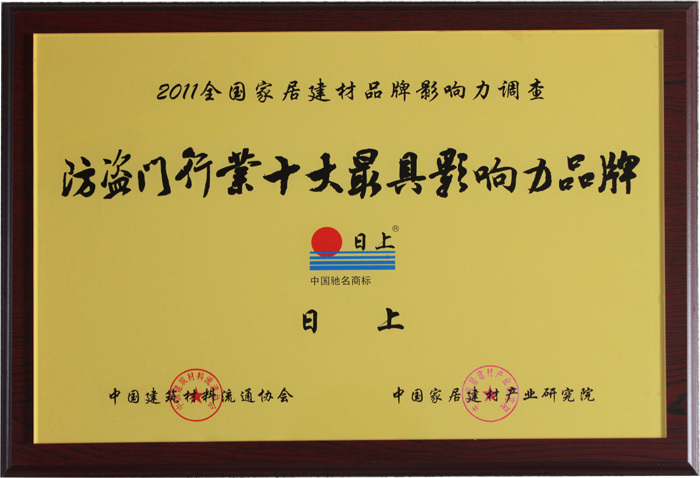 2011年全国家居建材品牌影响力调查日上防盗门荣获“防盗门行业十大最具影响力品牌”。